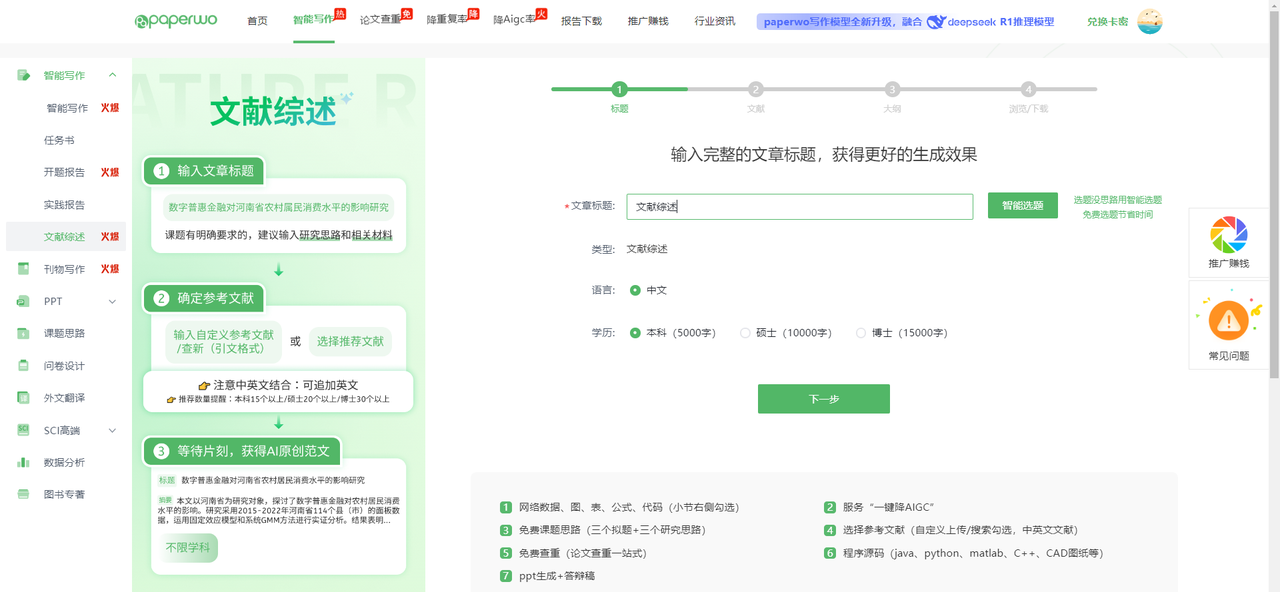 若仅确定了大致的研究领域(如 “数字普惠金融”),可先输入模糊标题,通过 AI 生成的综述梳理该领域的研究热点与空白,进而锁定具体的研究问题(如 “聚焦河南农村地区”),避免选题过于宽泛。