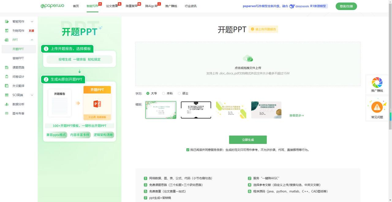 学术类:开题报告、论文答辩(完美衔接 paperwo 的论文写作功能,开题报告内容可直接同步生成 PPT);