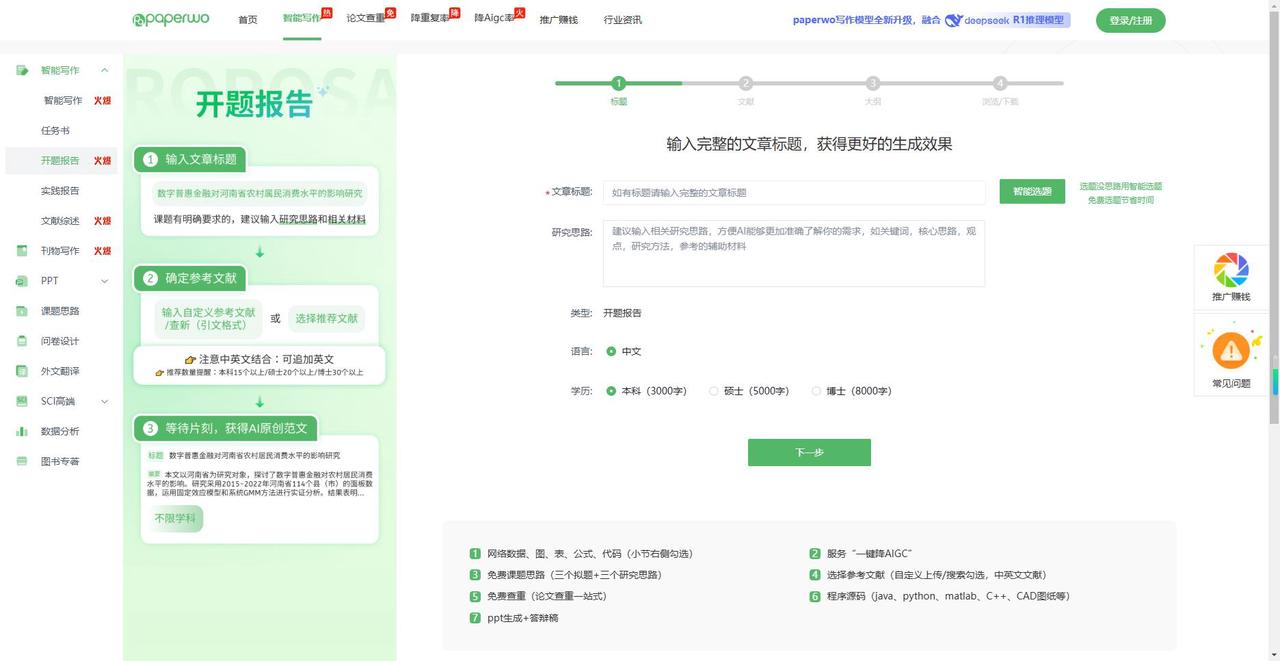 进入 paperwo 平台,选择 “开题报告” 功能:在左侧导航栏的 “论文写作” 分类下,点击 “开题报告”(界面显示该功能为 “火爆” 状态,可见使用率较高);